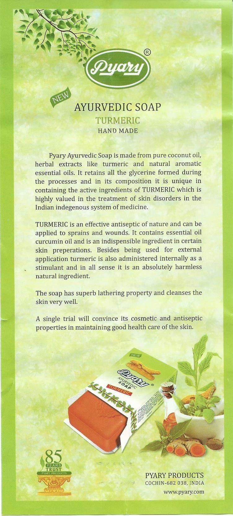 Pyary turmeric soap mixed with coconut oil the pyary ayurvedic toilet soap comes across as the most aromatic skin protector whose silky lather soothes even the most sensitive skin.