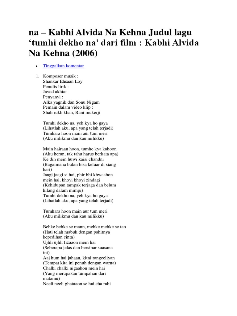 Tumhi dekho na lyrics from kabhi alvida naa kehna sung by alka yagniksonu nigam music directed by ehsaan nooraniloy mendonsashankar mahadevan music composed by ehsaan nooraniloy mendonsashankar mahadevan lyrics written by javed akhtar and starring shahrukh khan rani mukherjee amitabh bachchan abhishek bachchan preity zinta kirron kher.
